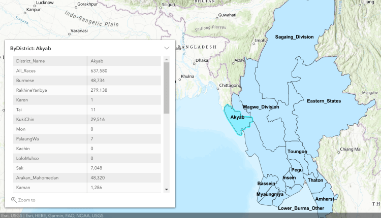 An example of my interactive ArcGIS map in use, providing the 1931 demographic data for each district of colonial Burma (Courtesy: Esri, ArcGIS Online).